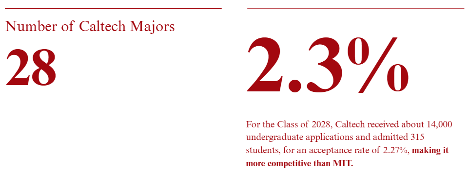 For the Class of 2028, Caltech received 13,863 applications, but only accepted 315 of those students, for an acceptance rate of 2.27%, beating out rival MIT (much to their chagrin!). The competitiveness of their admissions cycle is no joke, but their admissions website highlights the main qualities they look for in prospective applicants: “a love of math,” “a passion for chemistry and physics,” “an appreciation for humanities and the social sciences,” “resilience,” a “collaborative spirit,” “creativity,” and a “single-minded determination.” They add that “You don’t have to say you’re “well-rounded” — we know you love STEM first and foremost.” In other words, they understand that their best applicants can’t lay claim to an extensive interest in every pursuit because they want to be the best researchers and innovators in each field. At OPUS, we’re here to help our students demonstrate to Caltech why and how all of that specialized focus has paid off!