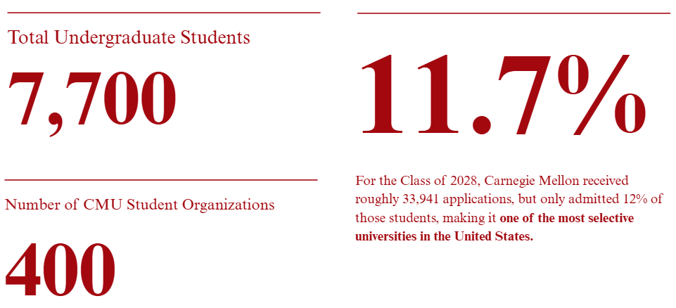 33,941 students applied to be a part of CMU’s Class of 2028. Of those applicants, 12% were admitted, which was one of the university’s lowest acceptance rates in the school’s history. The CMU Office of Undergraduate Admissions states that they take into account an applicant’s accordance with CMU’s “core values and core competencies, including diversity, equity, inclusion, collaboration, communication, community engagement, concern for others, self-directed learning and critical thinking.” The strongest applicants transform their resumes packed with rigorous coursework, extracurricular initiative, and civic engagement into a creative narrative that conveys the most significant aspects of themselves. Joining the ranks of the Tartans is no small feat, but OPUS is here to help!