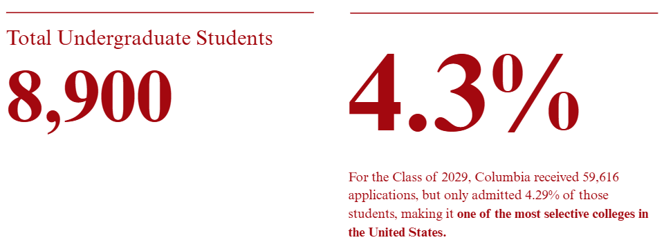 For the Class of 2029, Columbia received 59,616 applications and admitted 2,557, for an acceptance rate of 4.29%. According to the Office of Undergraduate Admissions, the main qualities Columbia looks for in applicants are “academic preparation,” “curiosity,” “engagement with others,” “individual voice,” and “knowledge of Columbia.” They use a holistic process that takes in the context of a student’s background when evaluating applications. Ensuring that the information in an application is presented cohesively, with a mind to these attributes, is essential in today’s competitive admissions cycle. OPUS is here to help you reach your dreams of sporting blue and white.