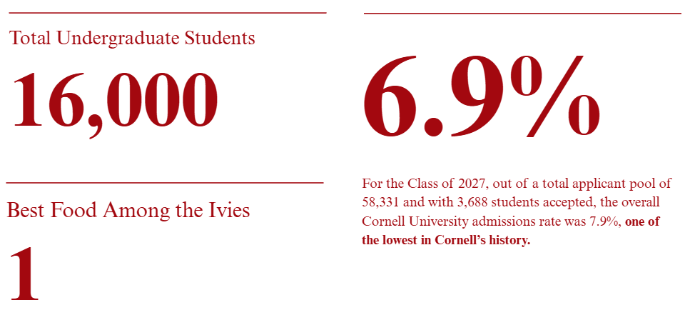 Across the many undergraduate schools, admission is very competitive. For admission to the Class of 2027, Cornell received 58,331 applications and admitted 3,688, for an acceptance rate of 7.9%. While the applicant pool data was not released for the Classes of 2028 or 2029, given the number of admits (5,139 and 5,824, respectively) and recent trends in Ivy League admissions, we would imagine there was a similarly low acceptance rate in more recent cycles. In order to get into Cornell, it is important to demonstrate your commitment to innovation, research, and academic excellence on the application. Here at OPUS, we are committed to helping you show your commitment!