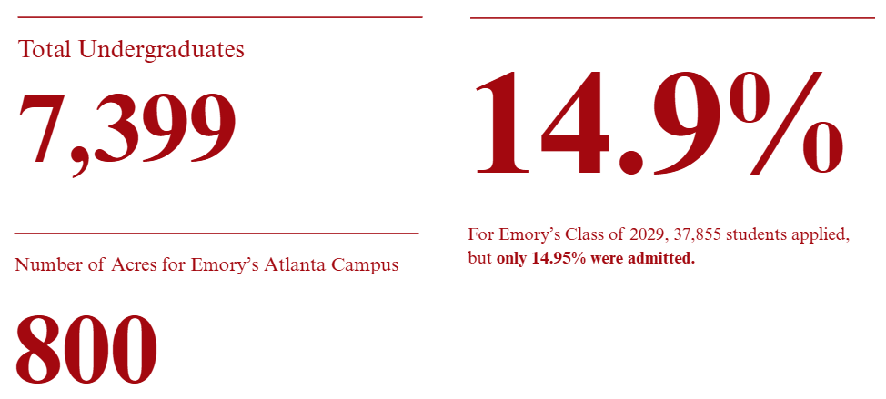 It is not easy to get into Emory, as acceptance rates for undergraduates have dropped precipitously in recent years. For admission to the Class of 2029, between Emory College and Oxford College, the university received a record-setting 37,855 applications and granted admission to 5,658 students, for an overall acceptance rate of 14.95%. Admission to Oxford College is slightly less competitive than at Emory College.
