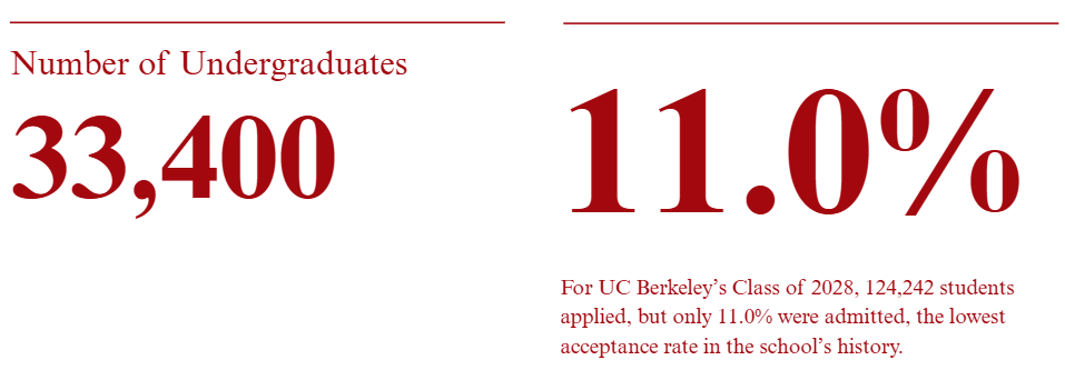 An astounding 124,242 students applied to be a part of Berkeley’s Class of 2028. 13,701 were offered admission, bringing the acceptance rate down to a historically low 11.0%. The Berkeley Office of Undergraduate Admissions highlights that “UC Berkeley pioneered the holistic review process at UC (now adapted by most of the UC campuses).” This holistic review process is responsible for a student body that combines the achievement of the Ivy League, the research prowess of MIT or CalTech, and the diversity of a large public institution. With acceptance rates likely to continue to decline, turning to OPUS to help craft the strongest application possible is a wise move for those who can’t wait to root for the Golden Bears!