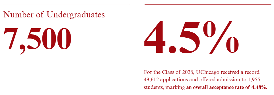 Today, UChicago is ranked among the most prestigious universities in the world for its immense $10 billion endowment, its legacy of steering American intellectual thought, and its record of producing high-achieving and financially successful alumni. Predictably, admission for undergraduates is incredibly competitive: of the 43,612 applicants to the Class of 2028, only 1,955 were accepted, for a minuscule acceptance rate of 4.48%.