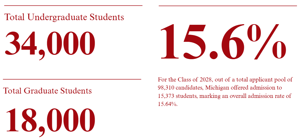In recent years, Michigan has culled its classes from some of the largest applicant pools in higher education. For admission to the Class of 2028, 98,310 students applied (roughly 23,000 more applications than UMich received a mere five years ago), while 15,373 were offered admission, for a record-low acceptance rate of 15.64%. According to Undergraduate Admissions, admissions officers use the following criteria to evaluate an applicant and assign a “rating:” “Secondary School Academic Performance;” “Educational Environment;” “Counselor and Teacher Recommendation;” “Essays;” and “Awards/honors, involvement, leadership, and service.”